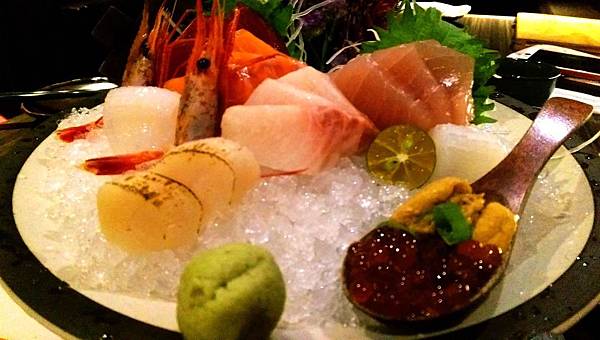 非常美麗的一道料理~鮭魚。鮪魚。旗魚。海鱺。干貝。牡丹蝦。鮭魚卵。海膽~~